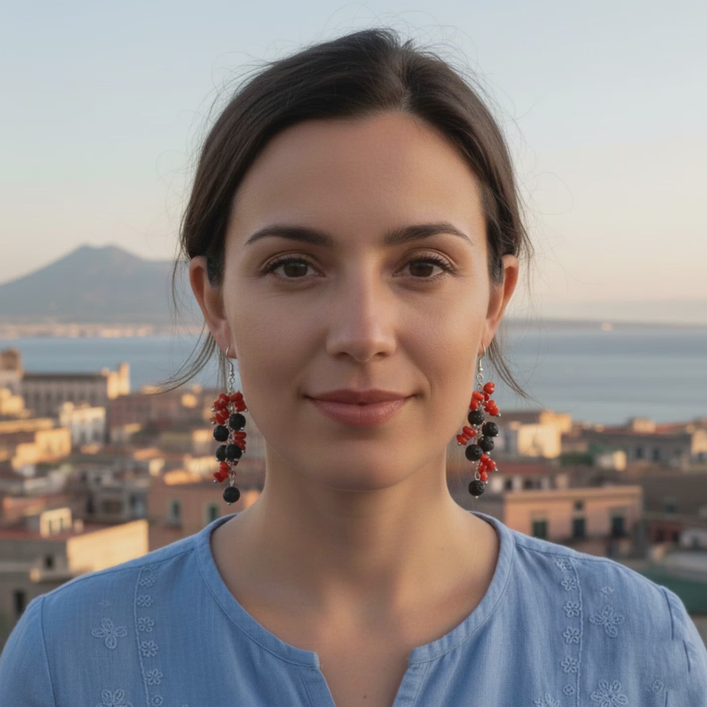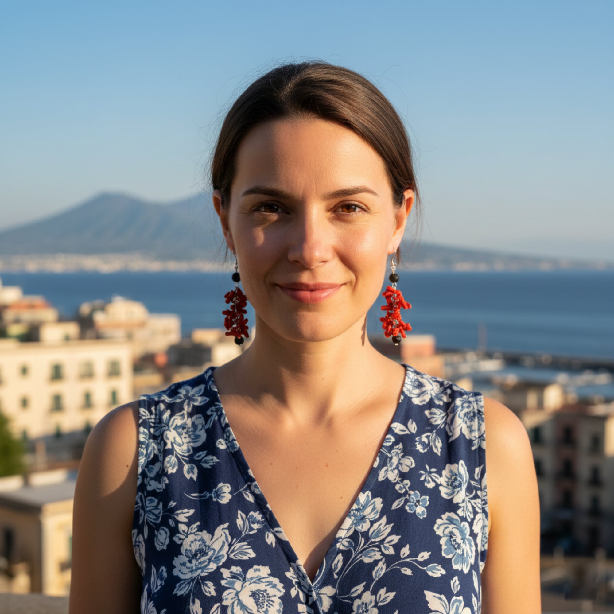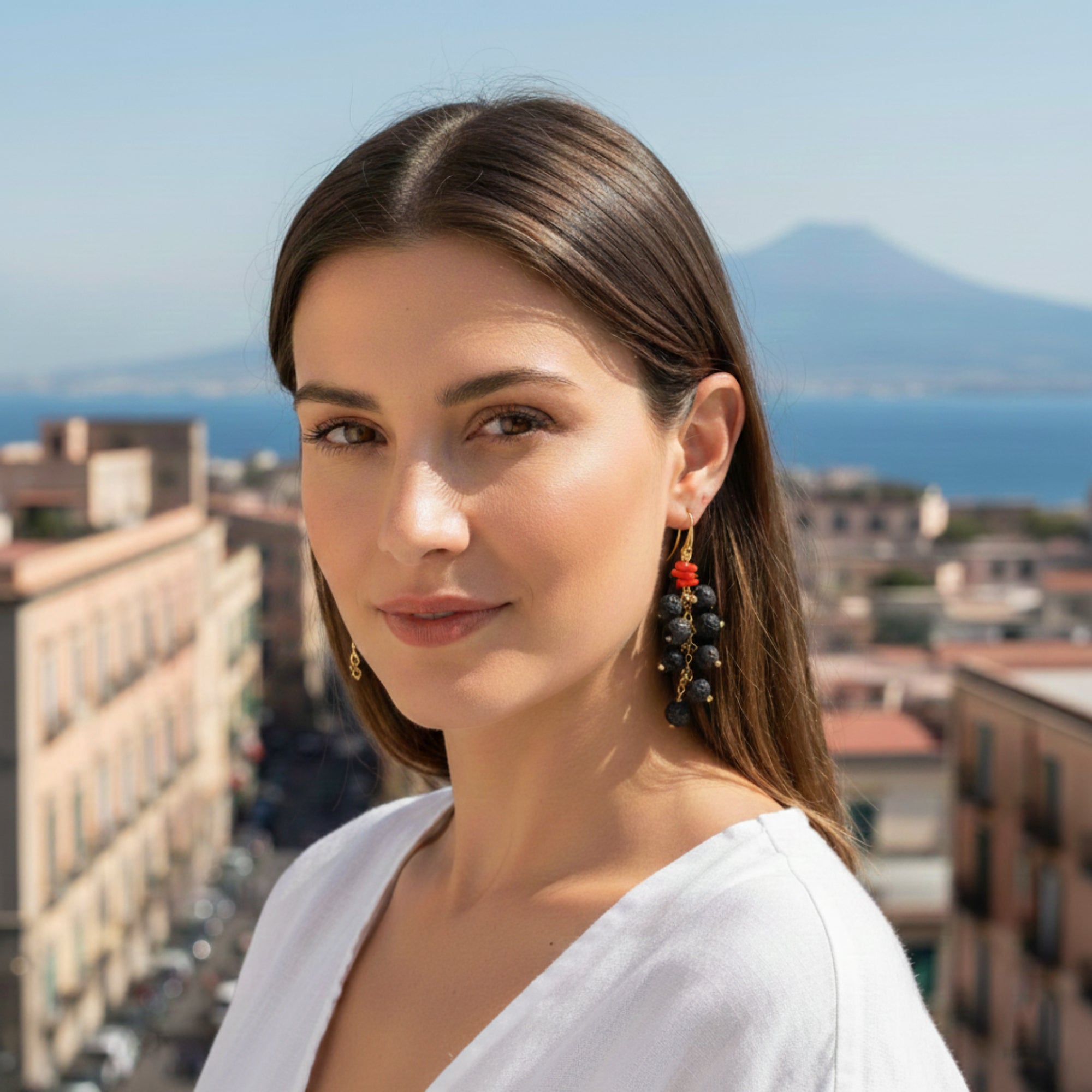Los pendientes con piedra de lava y coral son una joya exclusiva, realizada con materiales preciosos que evocan las tradiciones del arte mediterráneo. La piedra de lava, símbolo de fuerza y poder natural, se combina con el coral, apreciado desde hace siglos por sus propiedades protectoras y decorativas.